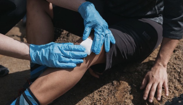 For small cuts on the finger, use a band-aid, but don't wrap it too tightly. For blisters on the heel, don't pop them; apply a hydrocolloid dressing directly. For a large red scrape on the knee, rinse with saline solution, cover with a foam dressing, and then wrap two layers of elastic bandage. For deeper cuts from rocks, apply pressure to stop the bleeding, disinfect with iodine, cover with sterile gauze, and secure with an elastic bandage. Seek medical attention at your destination.